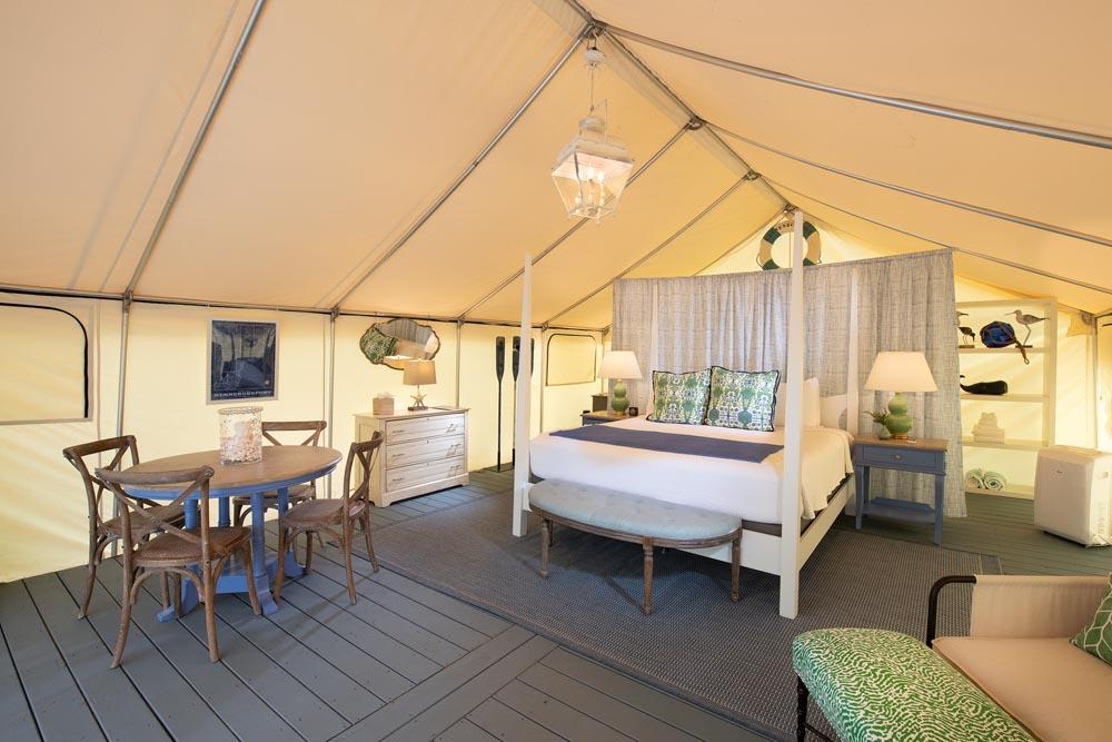 The interior of the Tradewinds glamping tent at Sandy Pines Campground, one of several camping options at the property. Sandy Pines Campground Photo