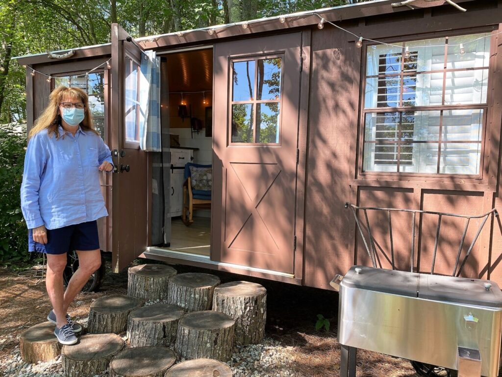Debra Lennon, founder of Sandy Pines Campground in Kennebunkport, stops outside a “shepherd’s hut,” one of the Unique Retreats at the campground. Tammy Wells Photo