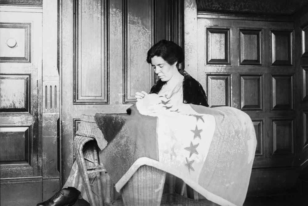 In this 1920s photo, Alice Paul sews a suffrage flag in Washington. One hundred years ago, American women gained the guaranteed right to vote, with ratification of the 19th Amendment. But to suffragist Paul, the vote wasn’t enough. She equipped herself with a law degree and got to work writing another constitutional amendment — one that would guarantee women equal rights under the law. National Photo Company Collection/Library of Congress via AP