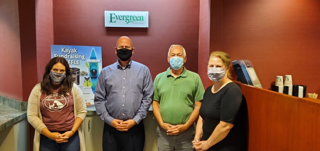 A summer-long kayak raffle by Evergreen CU raised over $8,200 for three lake associations, the Animal Refuge League of Greater Portland and several local food pantries. Shown are Jeana Roth, Animal Refuge League of Greater Portland; Jason Lindstrom, Evergreen CEO; Tim Greer, Little Sebago Lake Association; and Cheryl Rawson, Collins Pond Improvement Association. Contributed