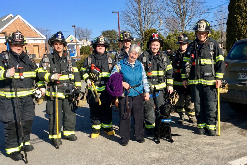 Janet Amberger with members of the Scarborough Fire Department and Cleo, a Labrador retriever she is raising for Guiding Eyes for the Blind. Amberger said introducing the dogs to a large number of people in many different environments helps with training. Photo submitted by Janet Amberger