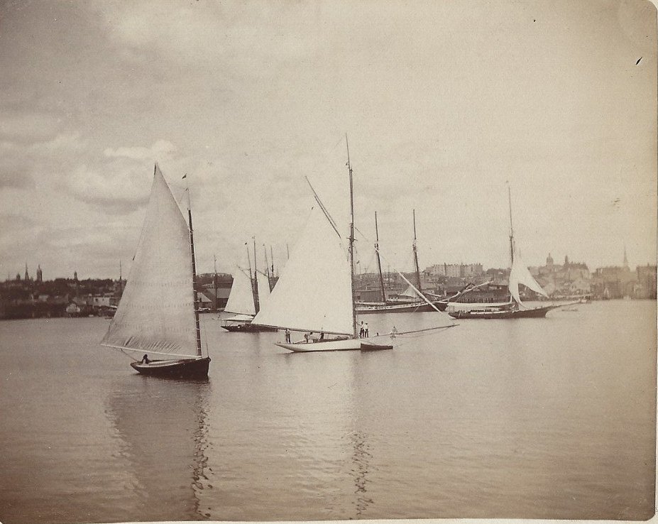Portland Harbor was once teeming with sloops, schooners, brigs, barks and ships of all sizes. This circa 1890 image shows several sloops and schooners, with Portland in the background. H.M. Payson Collection at South Portland Historical Society.