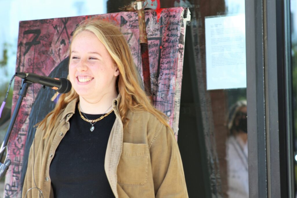Violet Frizzle, a Brunswick High School senior, talks about her experience painting Fort Andross during the pandemic for a new art exhibit that opened in Merrymeeting Plaza on Tuesday. Hannah LaClaire / The Times Record