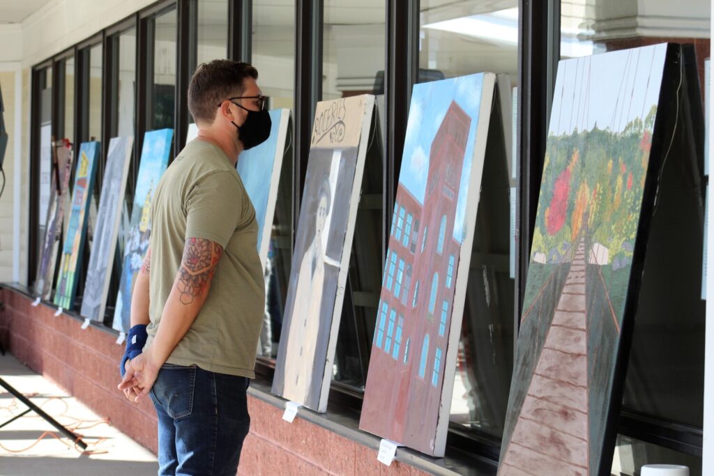 A spectator views the paintings on display in a new public art exhibit in Merrymeeting Plaza. Student artists showcased Brunswick’s landmarks and history in “Brunswick Perspectives: Our Past Informs Our Future.” Hannah LaClaire / The Times Record