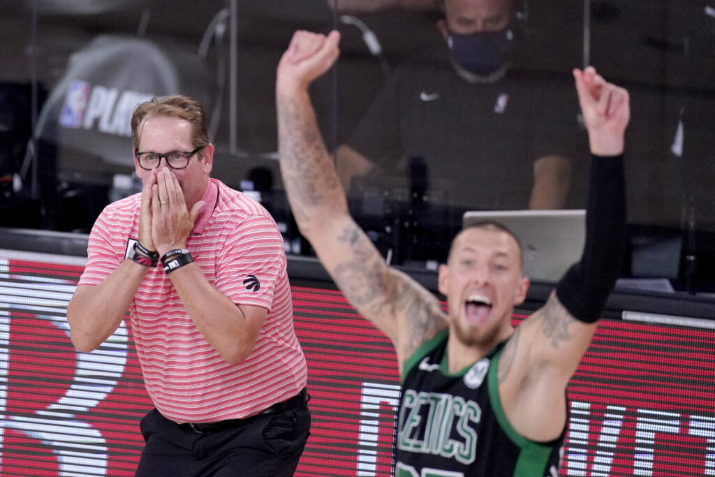 Toronto Coach Nick Nurse, left, and Boston’s Daniel Theis react during the second half of Friday’s Game 7 in Lake Buena Vista, Fla. Mark J. Terrill/Associated Press