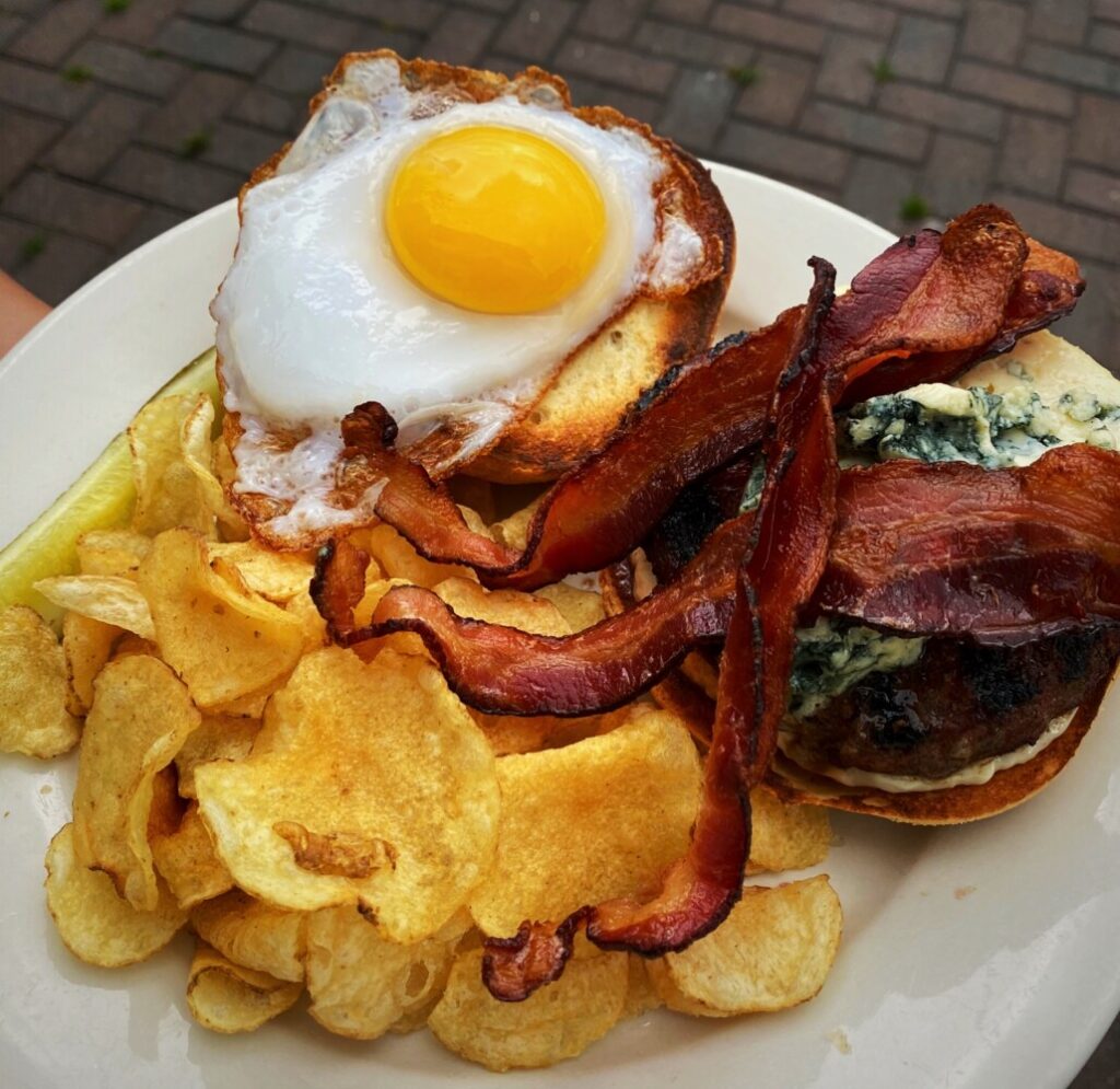 Doug Lavallee, owner and chef of Scarlet Begonias, has created a very unique burger that he recently featured as a special at the Brunswick restaurant. It’s named the “Quack and Blue” burger and it is made of locally sourced ingredients combined in a creative and tasty way. The beef patty, from Bisson Farm in Topsham, is sprinkled with blackening seasoning, grilled and placed on a lightly grilled brioche bun. Then it is topped with blue cheese and crispy bacon. On the other side of the bun is a sunny side up jumbo duck egg from Whatley Farms, also in Topsham. Their burgers are in the $6-$9 range. 16 Station Ave., 721-0403.