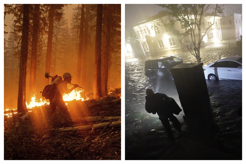 This combination of photos shows a firefighter at the North Complex Fire in Plumas National Forest, Calif., on Monday and a person using a flashlight on flooded streets in search of their vehicle, Wednesday, in Pensacola, Fla. In the past week, swaths of the country have been burning and flooding in devastating extreme weather disasters. Noah Berger, Gerald Herber/Associated Press