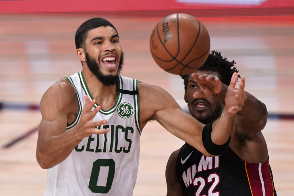 Boston’s Jayson Tatum and Miami’s Jimmy Butler battle for a rebound during Game 6 of the Eastern Conference finals on Sunday in Lake Buena Vista, Fla. Mark. J. Terrill/Associated Press