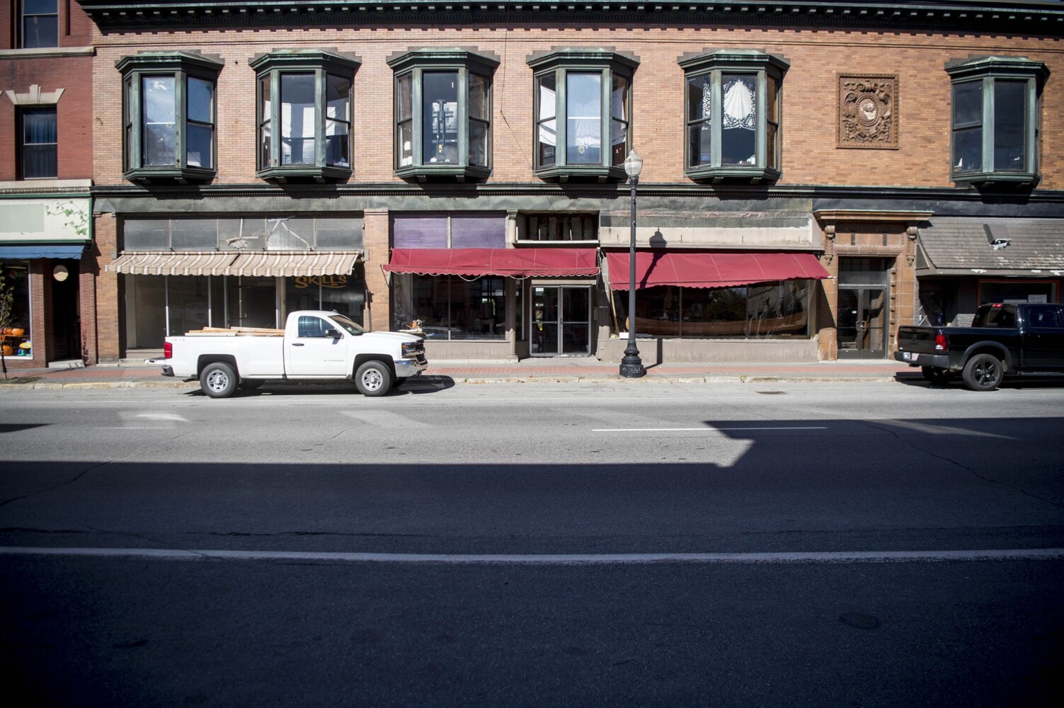 Overman Academy is in the building with the red awning and the canoe in the window on Water Street in Skowhegan on Thursday. Michael G. Seamans/Morning Sentinel