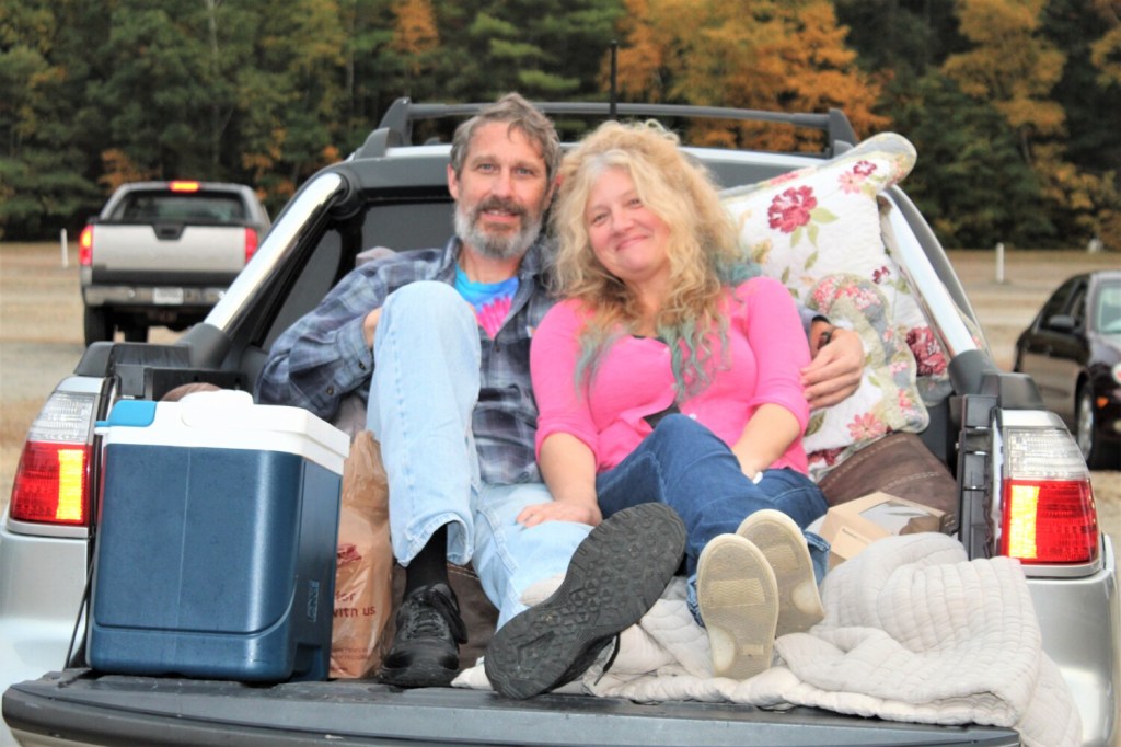 “This is seeing a movie in comfort,” said Paul Gross of Portland, cozied up in the back of pickup with Tatia Tyler of Westbrook.