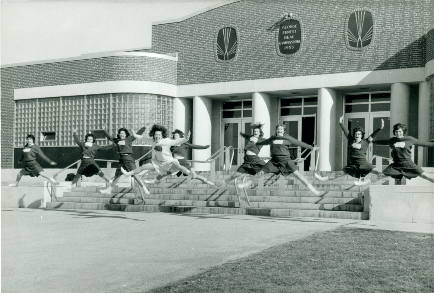 Cheerleaders at South Portland High School in front of the school in about 1965. The cheerleaders are Liv Harvey, Donna Conley, Pat Crangle, Judy O’Toole, Terry Langlois, Sue Gilmore, Noreen Massey, Cheryl Gordius and Bev Logan.