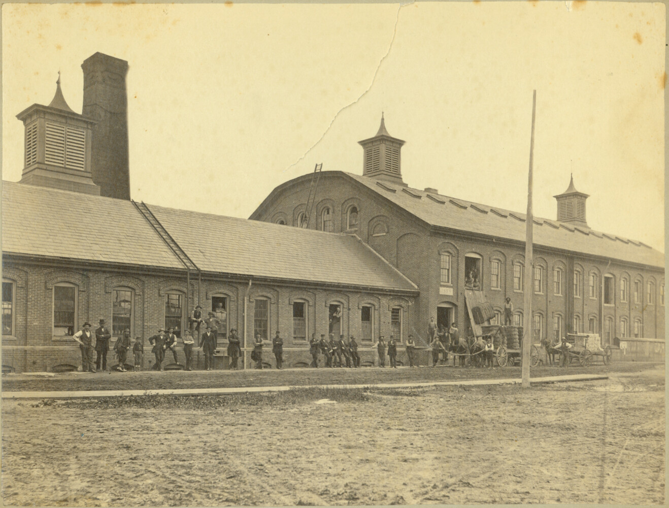Workers stand outside the Pejepscot Paper Mill Company in Topsham in 1880. The building also is known as the “Bowdoin Mill.”