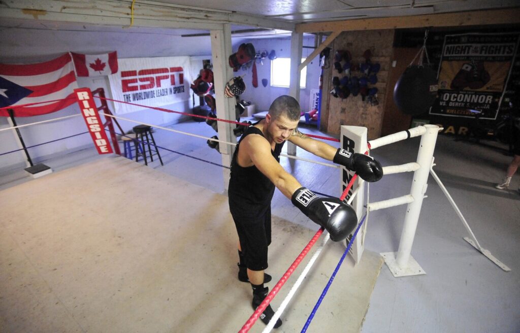 Brandon Berry takes a rest during a training session at Wyman’s Boxing Club in Stockton Springs on July 31, 2013. Michael G. Seamans/Morning Sentinel
