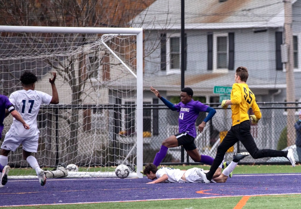 Portland, which beat visiting Deering earlier this month, 1-0, on an improbable, wind-aided goal from senior goalkeeper Henry Flynn, opened the scoring in the seventh minute on another fluky tally, this time from junior Ben Horrisberger, who collided with a defender and Rams senior goalkeeper Sam Spach, but still managed to direct the ball into the goal.