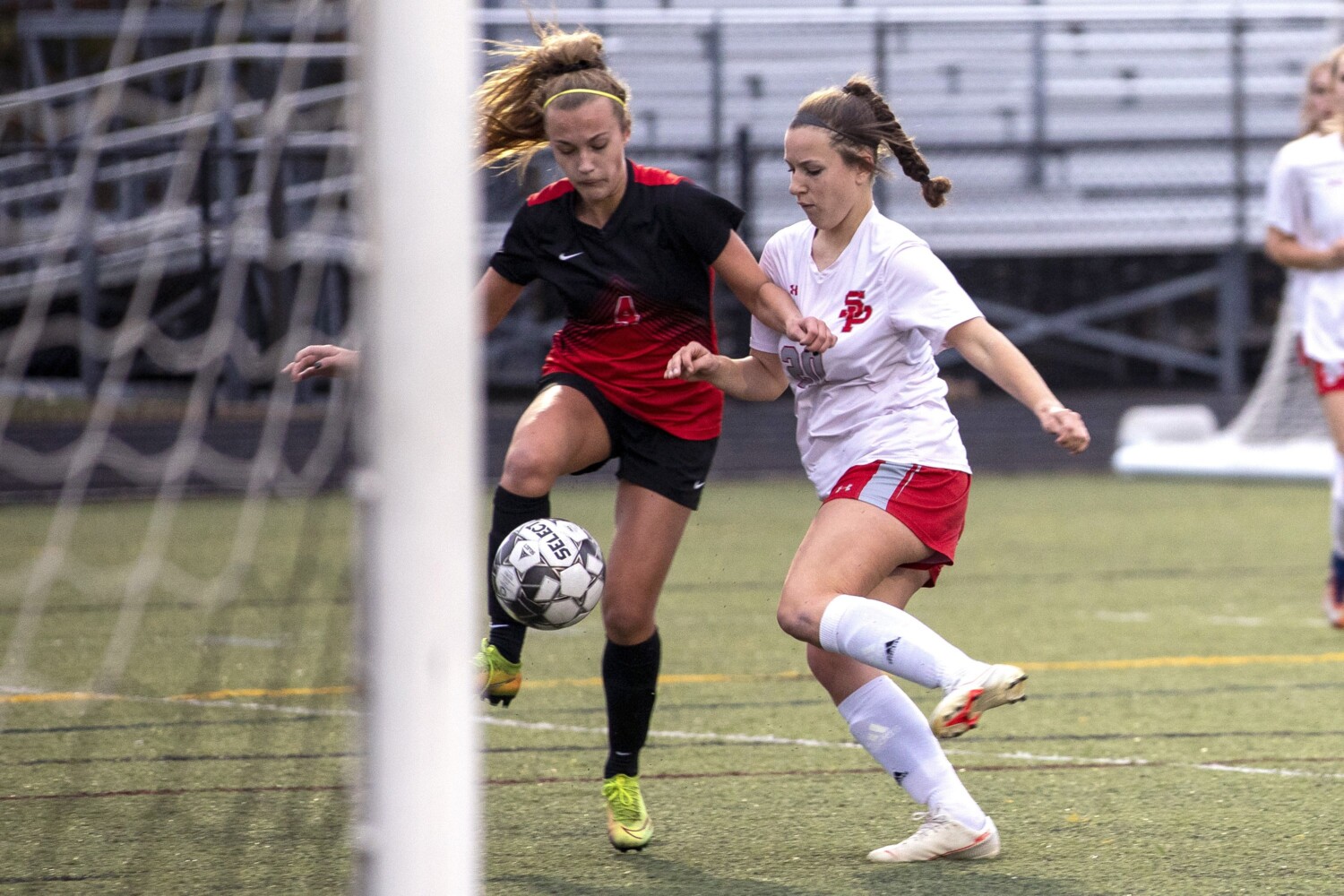 Scarborough’s Ali Mokriski is defended by South Portland’s Julia Flaherty during the Red Storm’s 2-0 victory Tuesday. Brianna Soukup / Portland Press Herald