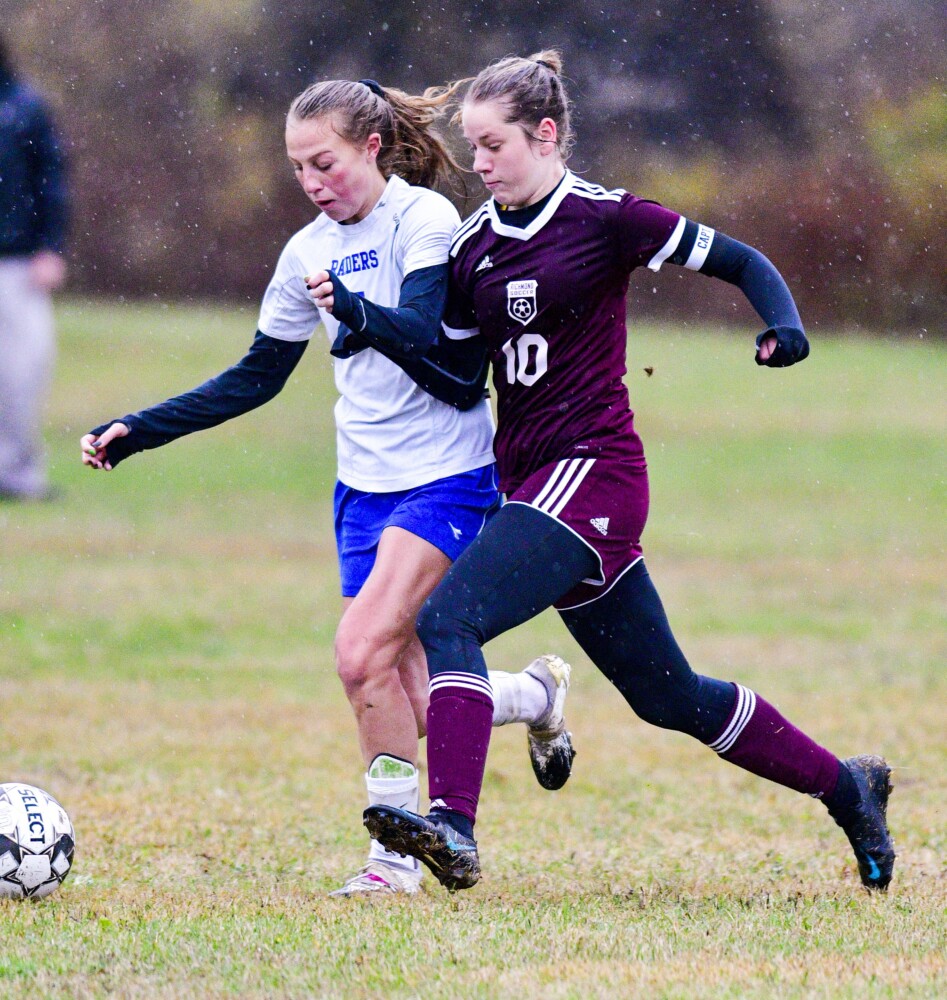 Richmond’s Alana Hixon, left, and Oak Hill’s Emily Dillman, fight for the ball Thursday in Richmond. Joe Phelan/Kennebec Journal Buy this Photo