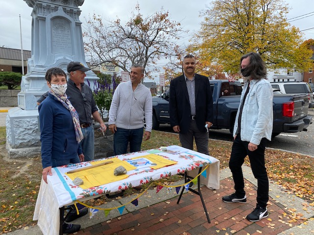Holly Culloton, left, and John Collins, second from the left, of Biddeford and Saco Area Showing Up for Racial Justice were on hand Friday morning outside Biddeford City Hall to offer support to new voters. Collins chats with Adil Karim, while Sultan Jasim chats with Biddeford Adult Education Engliah Language Learners instructor Sam Smithwick. Tammy Wells Photo