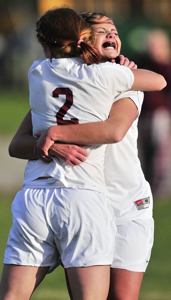 Noell Acord, left, hugs teammate Danica Hurley after Hurley scored a goal during the 2010 Western Maine Class D championship game in Richmond. Joe Phelan/Kennebec Journal