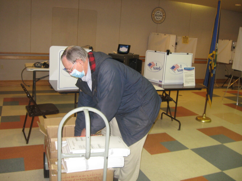 Buxton Election Warden Hiram Davis at work Tuesday before polls opened at 6 a.m. Town Election Warden Hiram Davis at 5 a.m. Tuesday was unboxing and counting packets of ballots as officials readied to open the polls at 6 a.m. Town Clerk John Myers reported he had accepted 3,555 absentee ballots. The town had 6,320 registered voters on July 13. Registrar of Voters Ruth Scheibenpflug, who has worked elections since 2007, said early Tuesday this has been the busiest one she has seen. Robert Lowell / American Journal