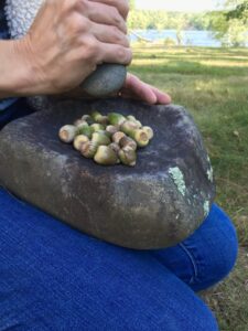 Columnist Avery Yale Kamila grinds acorns with an ancient mortar and pestle, both found along the shoreline of the former Cobbosseecontee Stream, now Pleasant Pond, in Litchfield. Many Wabanaki artifacts have been found on this property where Kamila grew up. Photo by Alden A.M. Hill