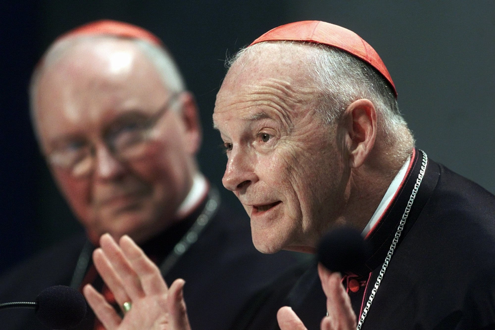 Then-Washington Cardinal Theodore McCarrick, right, flanked by head of the Pontifical Council for the Laity at the Vatican Cardinal James Francis Stafford, speaks at a news conference at the Vatican concluding a two-day meeting between Pope John Paul II and U.S. cardinals at the Vatican in April 2002. AP Photo/Santiago Lyon, File