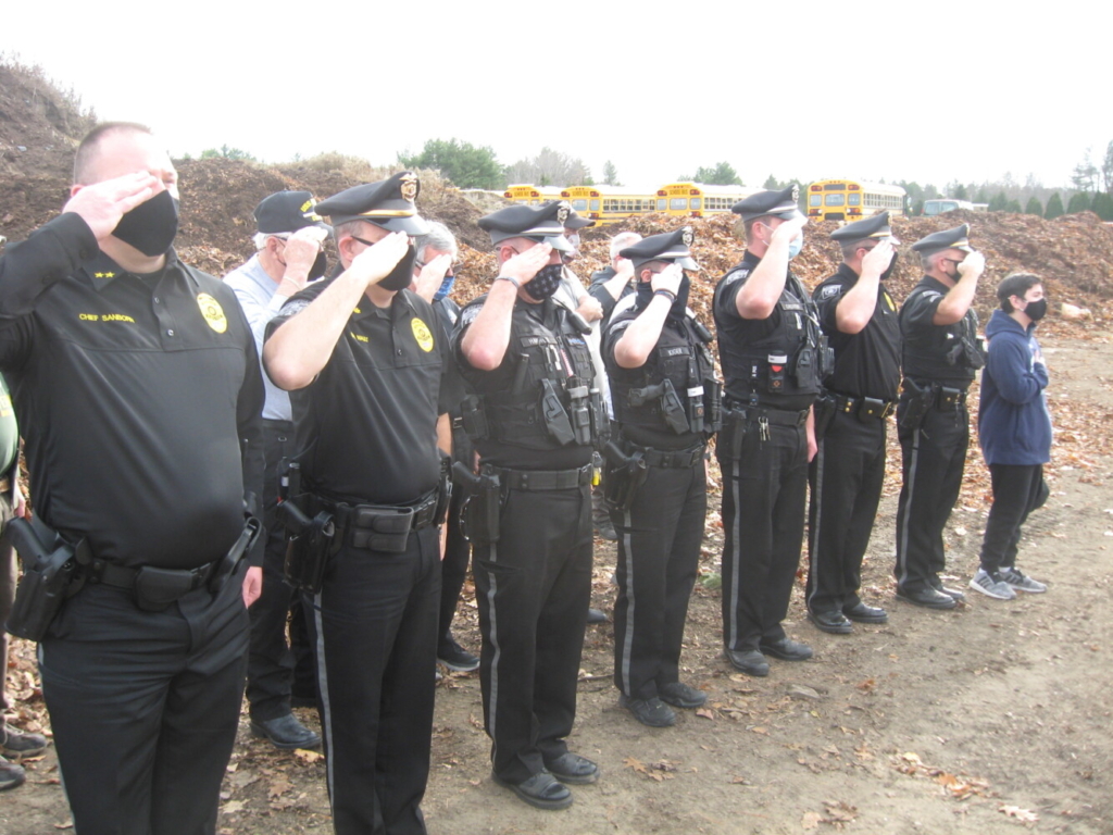 Gorham’s thin blue line salutes during a Veterans Day observance last week. They are, from left, Chief Chris Sanborn, Deputy Chief Michael Nault, Officer Dean Hannon, Officer Chelsea Kiger, SRO Todd Gagnon, Lt. Dana Thompson, Sgt. Ted Hatch and Santino Bruni, son of Officer David Bruni. Robert Lowell / American Journal