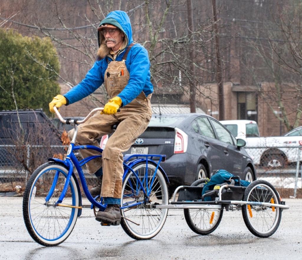 Paul Swearinger of Auburn rides his custom built bike through a parking lot in Auburn in March on his way to the Androscoggin River to collect driftwood to carve into pieces of art. Investing in bicycle and pedestrian infrastructure and public transit promotes modes that are low- or no-emission. Russ Dillingham/Sun Journal