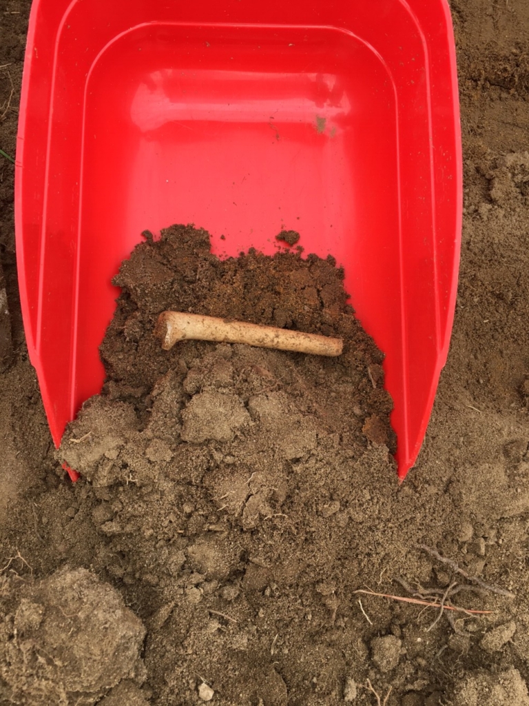 Archaeologists find a broken pipe stem while excavating a 17th-century dwelling off Foreside Road in Topsham. Photo courtesy of Chris Gutscher