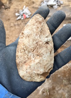 Chris Gutscher of the Merrymeeting Bay Pioneers Project, found a projectile point at an archaeology dig of a 17th century dwelling that would have been made at the location 3,000 to 4,000 years ago for a spear by Native Americans. Photo courtesy of Chris Gutscher