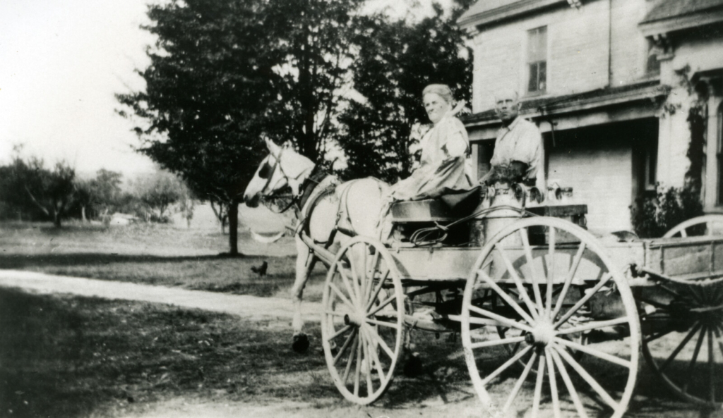 Mr. and Mrs. John Britt of North Yarmouth delivering milk in a typical morning scene, circa 1915. After milking the cows, farmers loaded wagons with cans of milk and cream to be taken to the local store or, later, to the railroad in time for the early morning milk train that passed through North Yarmouth on the Maine Central Railroad (the line through Walnut Hill) or Atlantic and St. Lawrence Railroad (now the Grand Trunk, beginning in 1853).