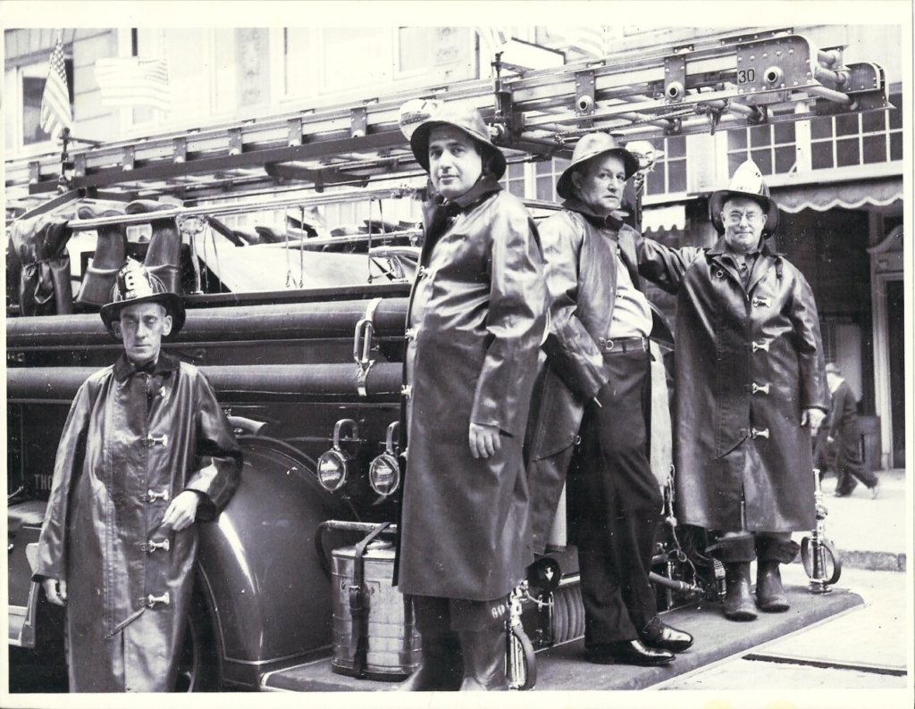 Firefighters from Engine 6 showed up for a Flag Day celebration in 1942 with their 1941 Mack fire truck. From left are Larry Stoddard, Louie Nappi, Charles Bryce and Lt. Cedric Brigham. South Portland Historical Society photo