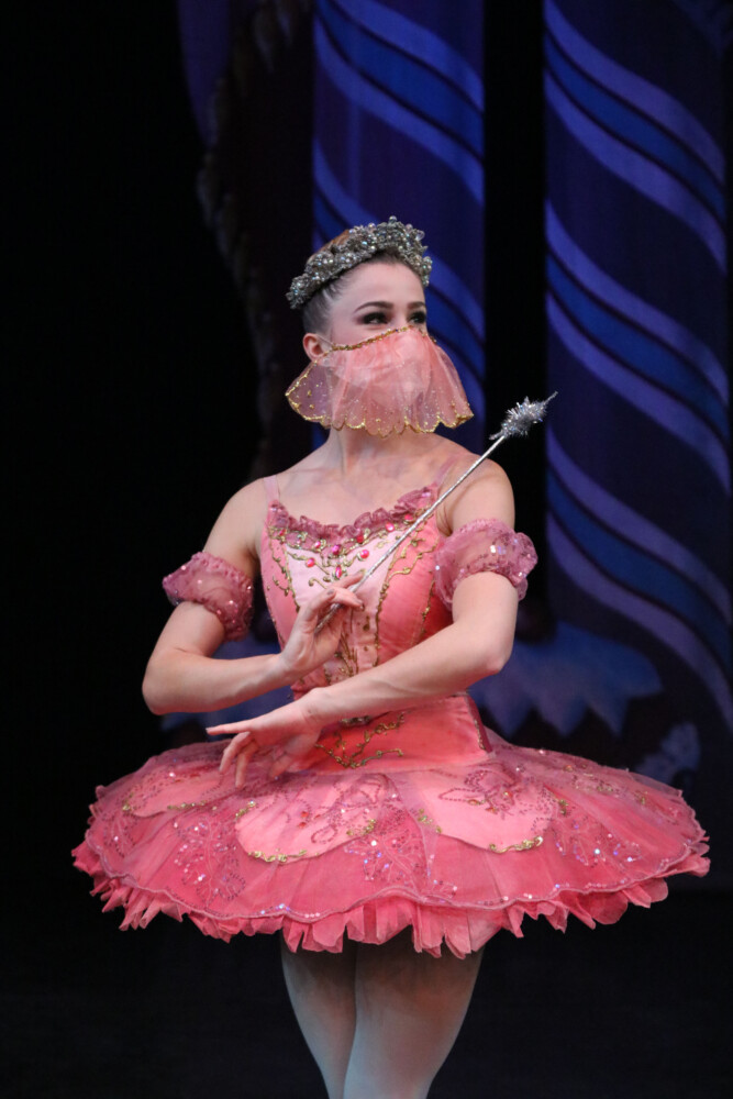 In a sign of the times, all performers wear masks, beautifully rendered by Gail Csoboth, whose costume designs overall are remarkable. The dangling “snowflakes” on the dresses of the dancers during the famous scene that ends the first act, for example, provide a great deal of dazzle when enhanced by some special video effects.
