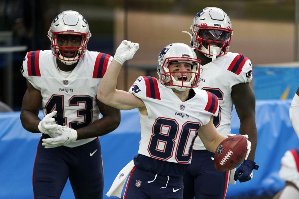 Gunner Olszewski celebrates after returning a punt for a touchdown during the first half of New England’s 45-0 win over the Los Angeles Chargers on Sunday in Inglewood, Calif. Ashley Landis/Associated Press