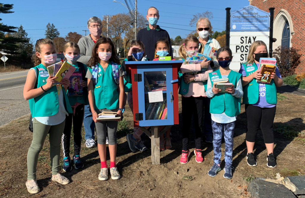 This fall, the Blue Point Congregational Church’s Mission Committee undertook a joint venture with the local Girl Scout Troop 629 to install a Little Free Library in front of the church building, 236 Pine Point Road. The LFL was made by Howard Charles and his wife, the Rev. Marcia Charles. The Girl Scouts, under the leadership of Jennifer Winchenbach and Priscilla Gushee, collected numerous boxes filled with books for children of all ages to enjoy.