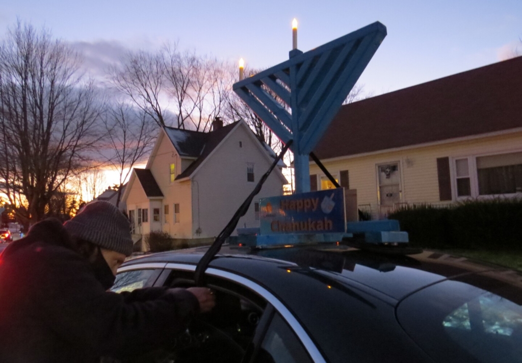 “I felt this was an innovative way and safe way to celebrate the holiday,” he said as he strapped a menorah atop his car.