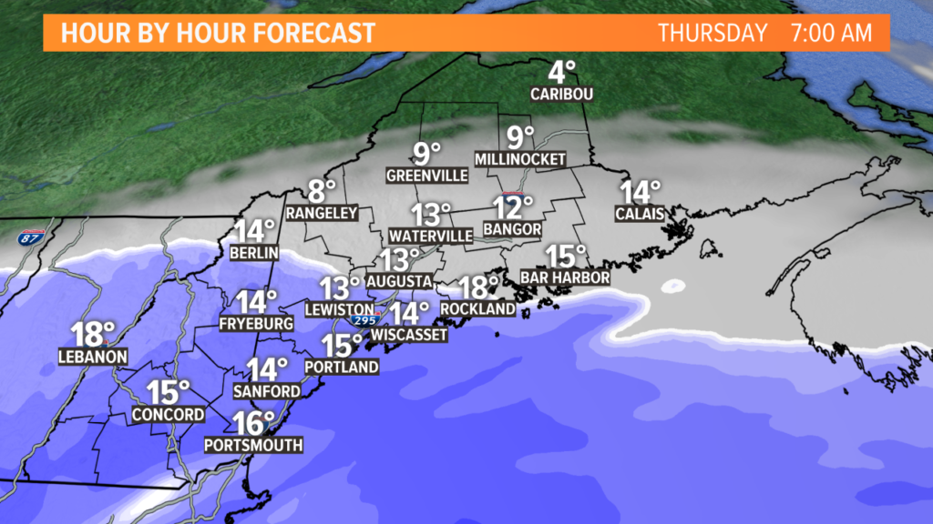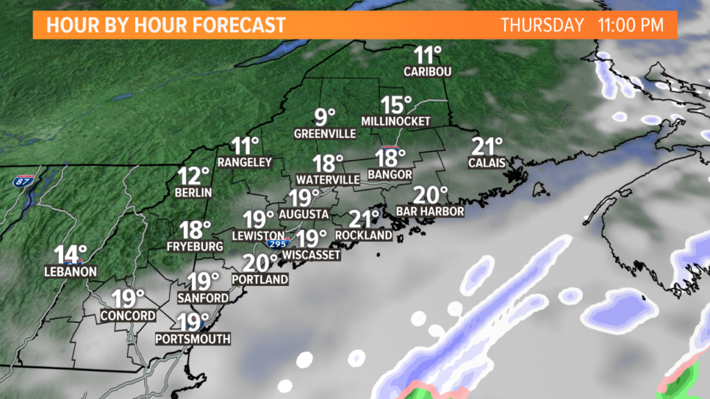 As the storm progresses north, snow showers begin through southwestern Maine, with the first flakes falling in Portland around 3 a.m.