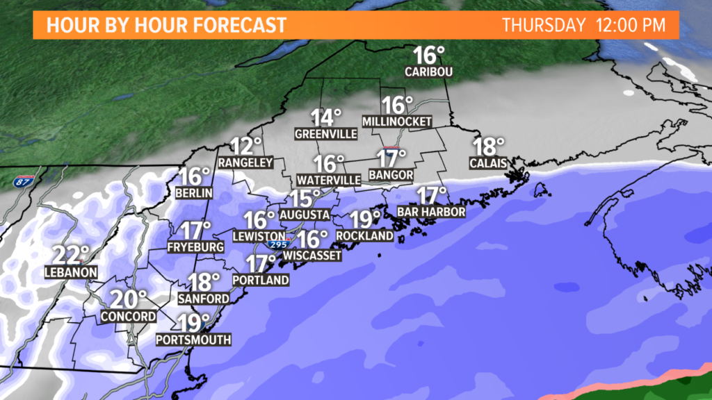 Expect the snow to keep slowly moving north. As the center of the storm gets closer, there will be some heavier snow along the Maine coastline up through Wiscasset and Rockland.