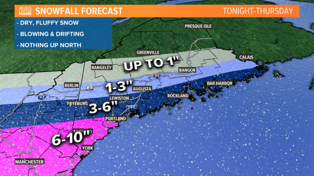 Given the latest forecast outlook, these totals seem pretty good. The bullseye for highest totals will be from Kittery to Portland and then east along the immediate coastline. Fryeburg to Lewiston will get a solid 3-6″ of snow, with a little bit less near Augusta.