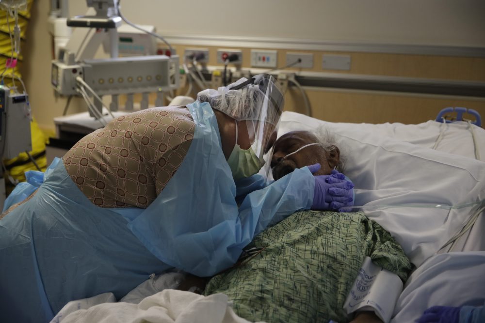 Romelia Navarro weeps while hugging her husband, Antonio, in his final moments in a COVID-19 unit at St. Jude Medical Center in Fullerton, Calif., on July 31. The U.S. death toll from the coronavirus topped 300,000 Monday. Jae C. Hong/Associated Press, File