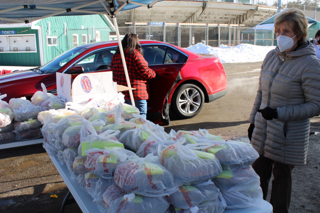 Spearheaded by volunteers, turkey dinners, with all the fixings and a dessert were handed out to hundreds of Old Orchard Beach residents on Dec. 23 in a drive thru event at The Ballpark. Courtesy Photo