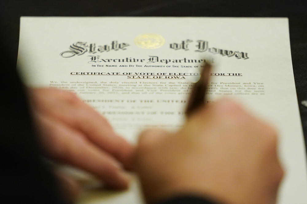 A member of Iowa’s Electoral College signs the Certificate of Vote of Electors for the State of Iowa on Dec. 14 at the Statehouse in Des Moines. People who want to change our presidential election system should consider state-level changes in how Electoral College votes are allocated. Charlie Neibergall/Associated Press