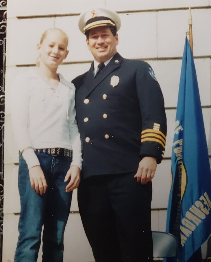 George Shutts’ son, Mike Shutts, also served as a firefighter on Engine 6. Mike is shown with his daughter, Audrey, in 2001, when he was promoted to deputy fire chief at the Portland Fire Department. South Portland Historical Society photo
