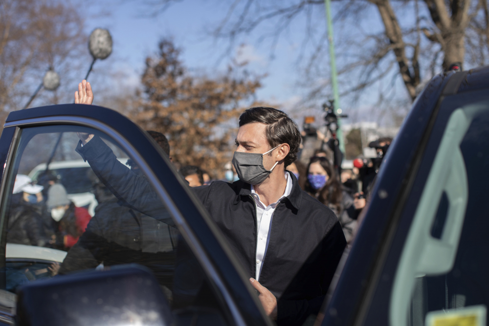 Democratic U.S. Senate challenger Jon Ossoff waves after speaking to the media at Dunbar Neighborhood Center during Georgia’s Senate runoff elections, Tuesday in Atlanta. Branden Camp/Associated Press