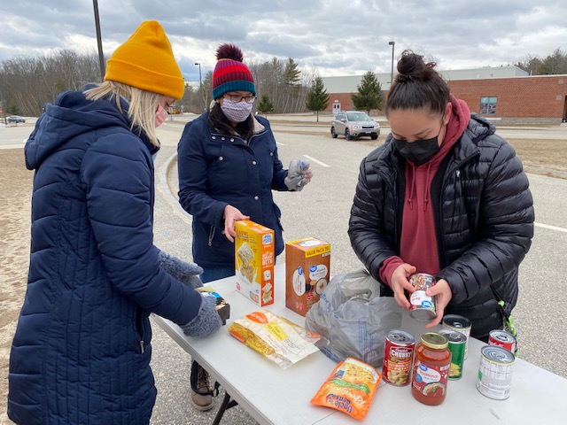 Volunteers Julia Lopez, Maria Passanisi and Salma Bezzat sort food donations during a Heart of Biddeford-sponsored sock and pantry drive outside Biddeford Middle School on Martin Luther King Jr. Day. Tammy Wells Photo