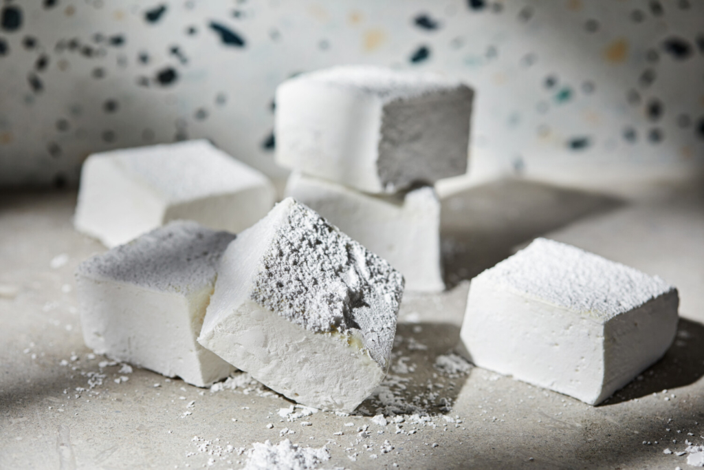 For this recipe, you’ll need a stand mixer and an instant-read or candy thermometer. Powdered, unflavored gelatin is bloomed in water while a mixture of sugar and corn syrup is boiled until it reaches 238 degrees, or softball stage on a candy thermometer. The hot syrup is then carefully poured over the gelatin and then whipped until it’s thick and bright white. A touch of salt and vanilla gives the candy some depth. Once set, it’s cut into squares and tossed in confectioners’ sugar.