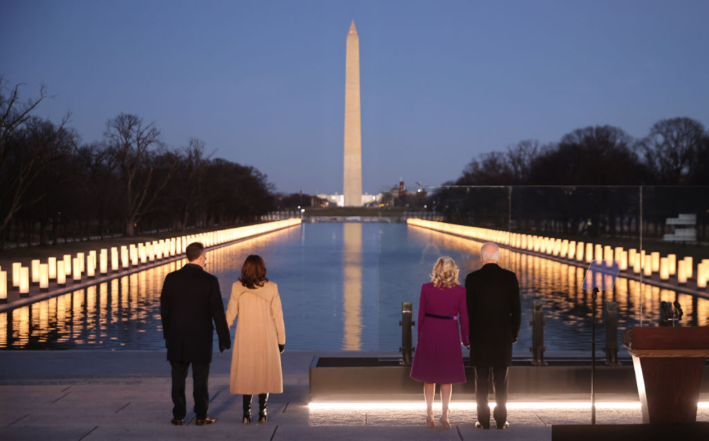 On the evening of Jan. 19, Doug Emhoff, left, Vice President-elect Kamala Harris, Jill Biden and President-elect Joe Biden look down the National Mall as lamps are lit at the Lincoln Memorial Reflecting Pool to honor the nearly 400,000 American victims of the coronavirus pandemic. Chip Somodevilla/Getty Images via TNS