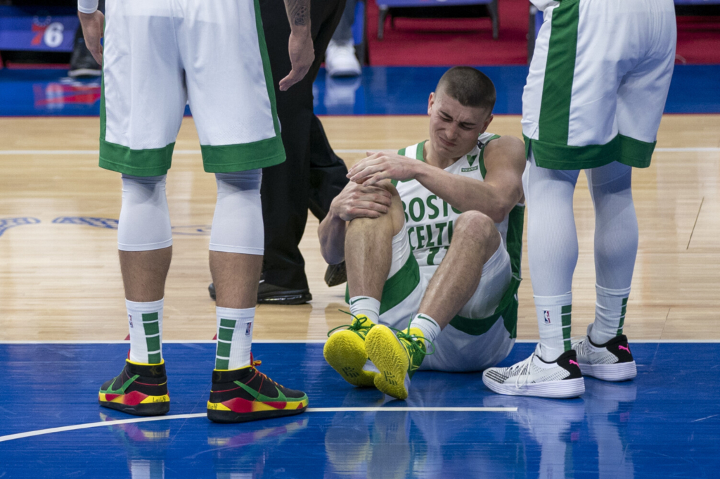 Celtics guard Payton Pritchard holds his knee after getting injured against the 76ers on Jan. 22. Pritchard has an MCL sprain. Chris Szagola/Associated Press