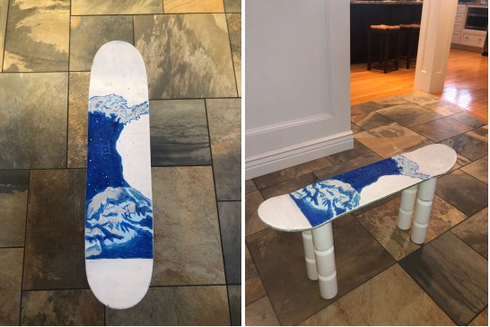 Two Falmouth High School students, MacKenzie Brewer and Amelia Graffam, made a table out of an old skateboard and cans in Ecomaine’s Upcycle 2020 challenge, said Matt Grondin of Ecomaine. Courtesy photo Matt Grondin