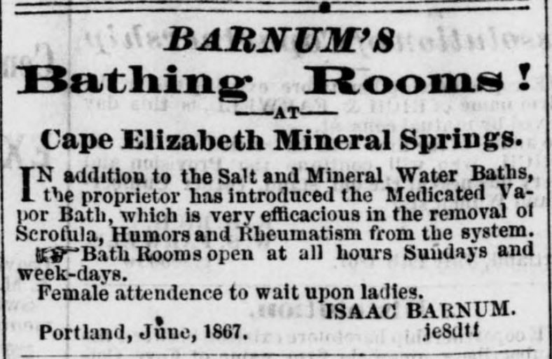 “Cape Elizabeth Mineral Spring – Isaac Barnum, the proprietor of Grand Trunk Dining Rooms, with much pleasure would announce to his friends and the public, that, having become fully convinced that the Mineral Water, issuing in such abundance from the premises of Dr. J.D. Buzzell, of Cape Elizabeth, possesses extraordinary efficacy and power, not only for the preservation of health, but in the removal of disease, he has purchased of said Buzzell, a fine lot of land, including the Mineral Spring, and is about to erect upon the same, large and commodious buildings for the accommodation of invalids, and all others who may desire the benefits of drinking and bathing in this medicinal water.