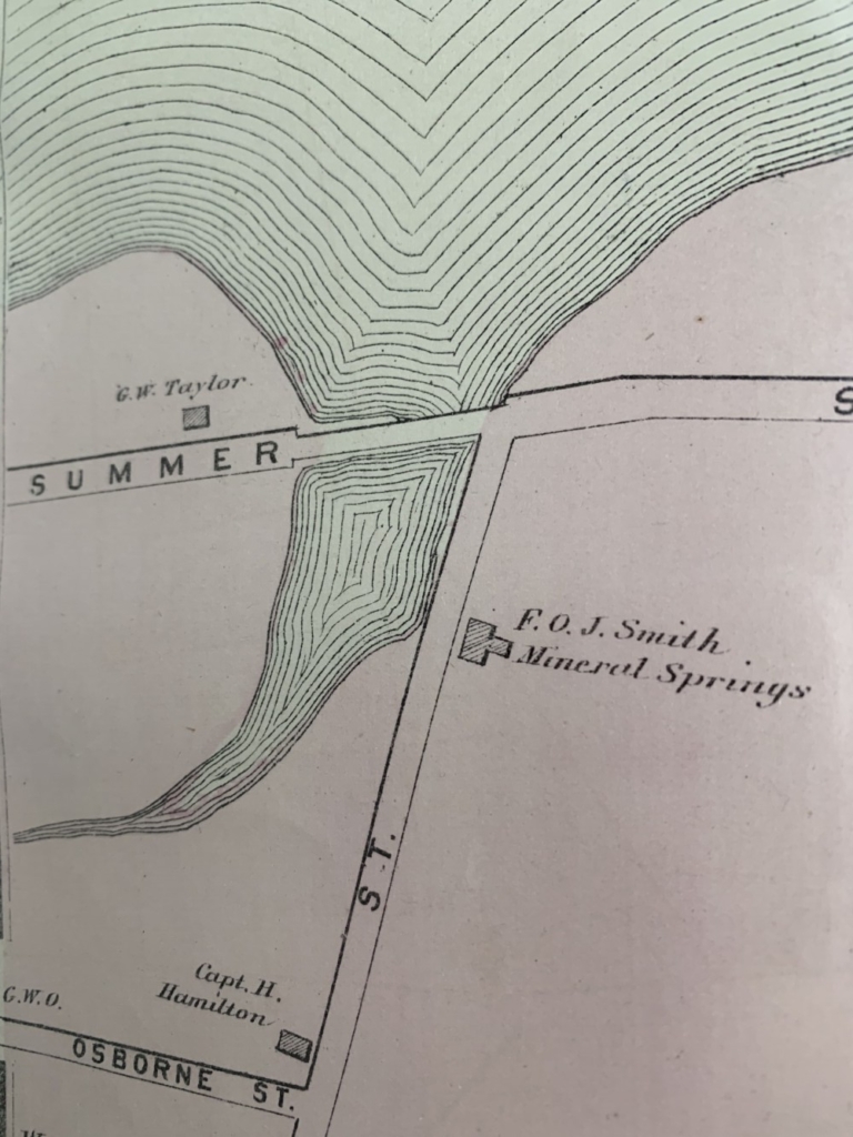 The 1871 FW Beers & Co. atlas identifies the FOJ Smith Mineral Springs on Anthoine Street. This is roughly in the area where the nursing home currently sits. South Portland Historical Society image